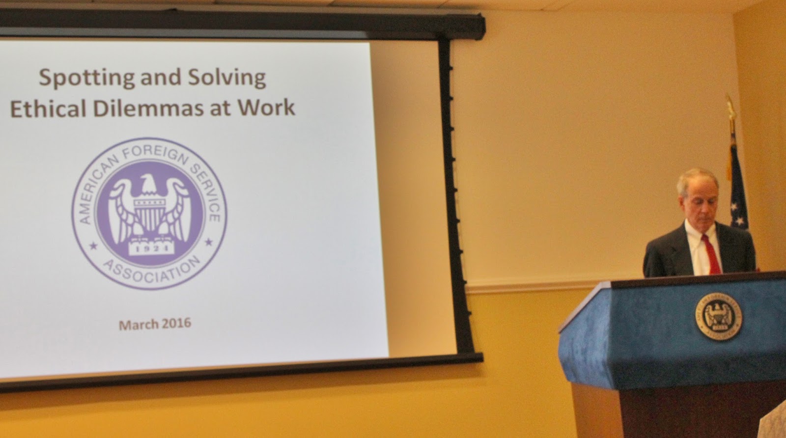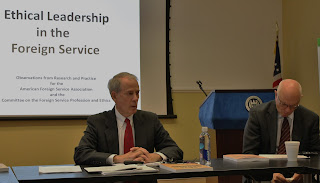 Hosted by AFSA's Committee on the Foreign Service Profession and Ethics (PEC), the purpose of the class was to improve attendees' ability to identify ethical issues in the work place and find ways to effectively deal with them. Newell, who has conducted presentations on ethics for AFSA in the past, began by stressing that some of the most prevalent ethics issues faced in the work place have nothing to do with violations of law or regulation, but are the ethical components of technical and management issues, which often are cases of right vs. right, rather than right vs. wrong.